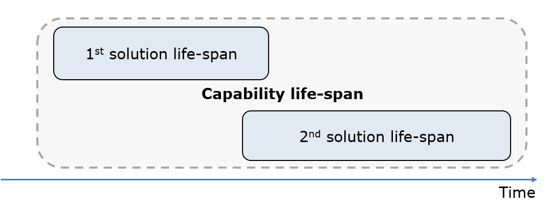 - Time span = solution life-span (usually a big project to deliver the first version and, optionally, several smaller evolution projects)